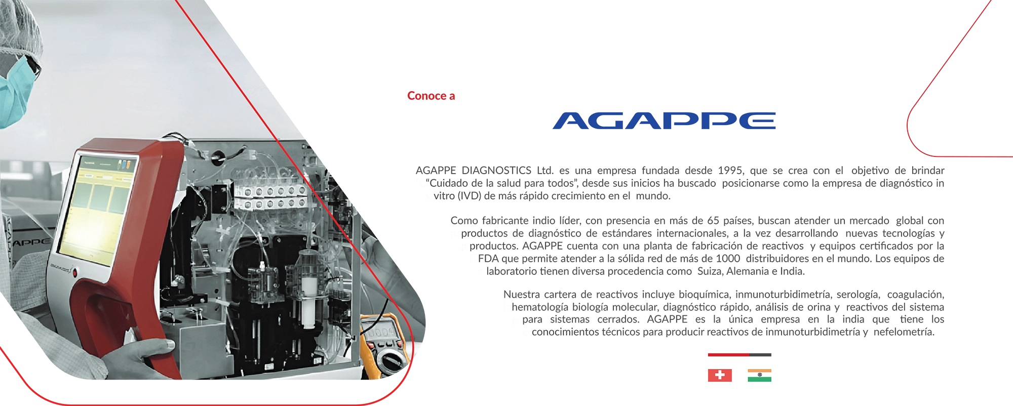 Como fabricante indio líder, con presencia en más de 65 países, buscan atender un mercado global con productos de diagnóstico de estándares internacionales, a la vez desarrollando nuevas tecnologías y productos. AGAPPE cuenta con una planta de fabricación de reactivos y equipos certificados por la FDA que permite atender a la sólida red de más de 1000 distribuidores en el mundo. Los equipos de laboratorio tienen diversa procedencia como Suiza, Alemania e India.