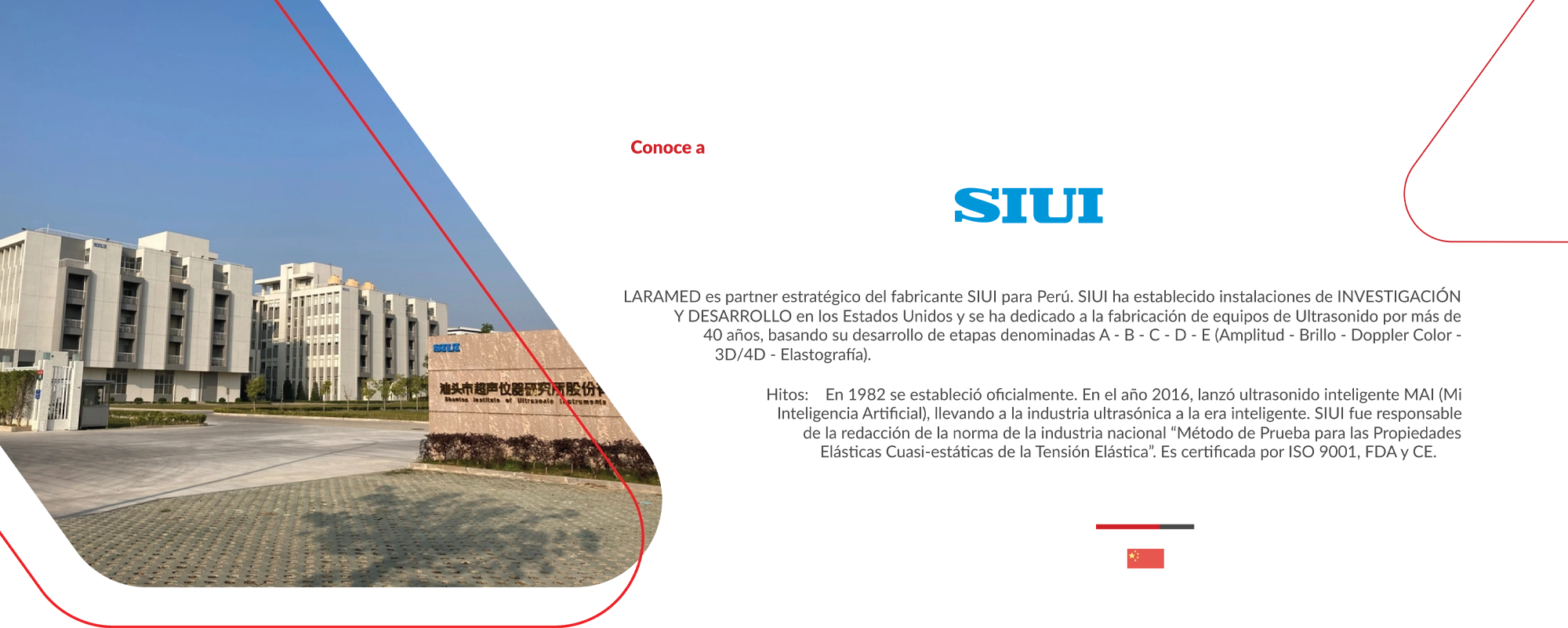 LARAMED es partner estratégico del fabricante SIUI para Perú. SIUI ha establecido instalaciones de INVESTIGACIÓN Y DESARROLLO en los Estados Unidos y se ha dedicado a la fabricación de equipos de Ultrasonido por más de 40 años, basando su desarrollo de etapas denominadas A – B – C – D – E (Amplitud – Brillo – Doppler Color – 3D/4D – Elastografía).